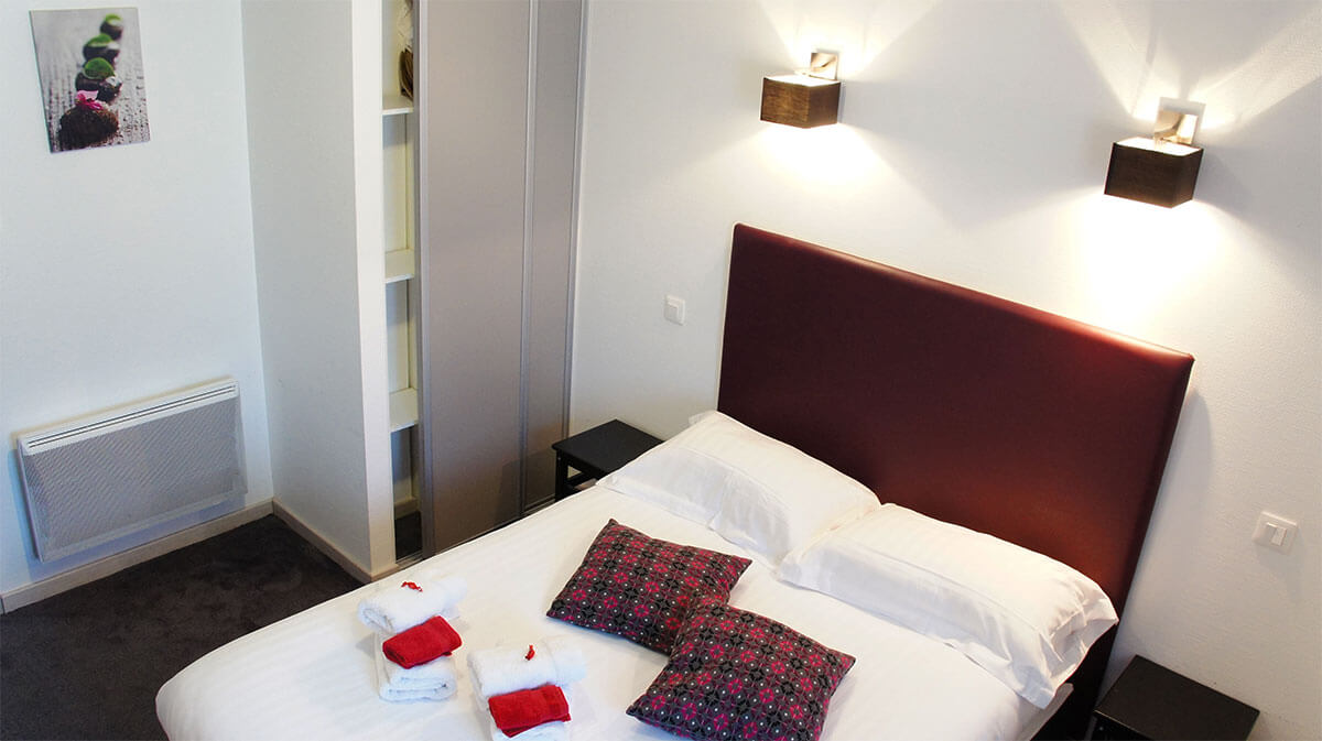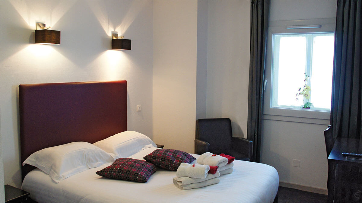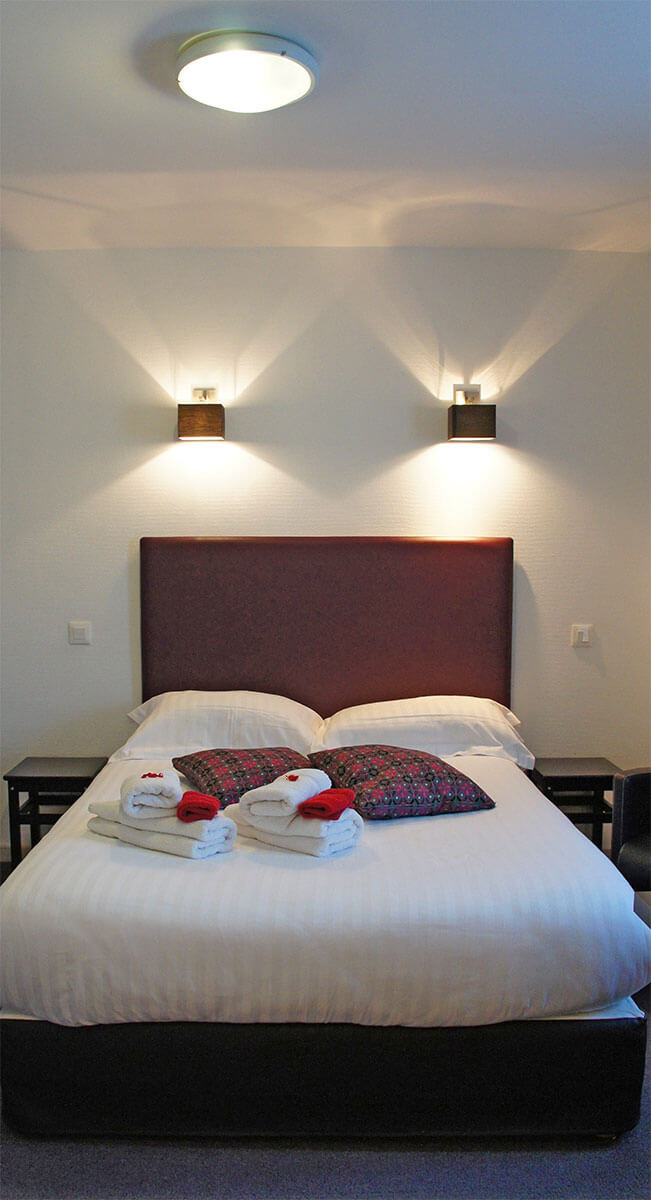 Chambre spacieuse entre 19 et 24 m² comprenant un lit double de 140 ou 160, avec salle de bain privative, douche, sèche cheveux, penderie, mini bar. Chambre prévue pour 2 adultes. Possibilité d'installer 1 lit d'appoint.