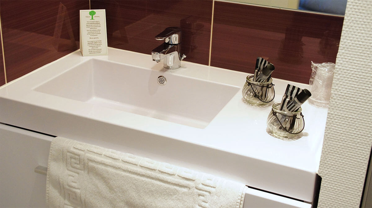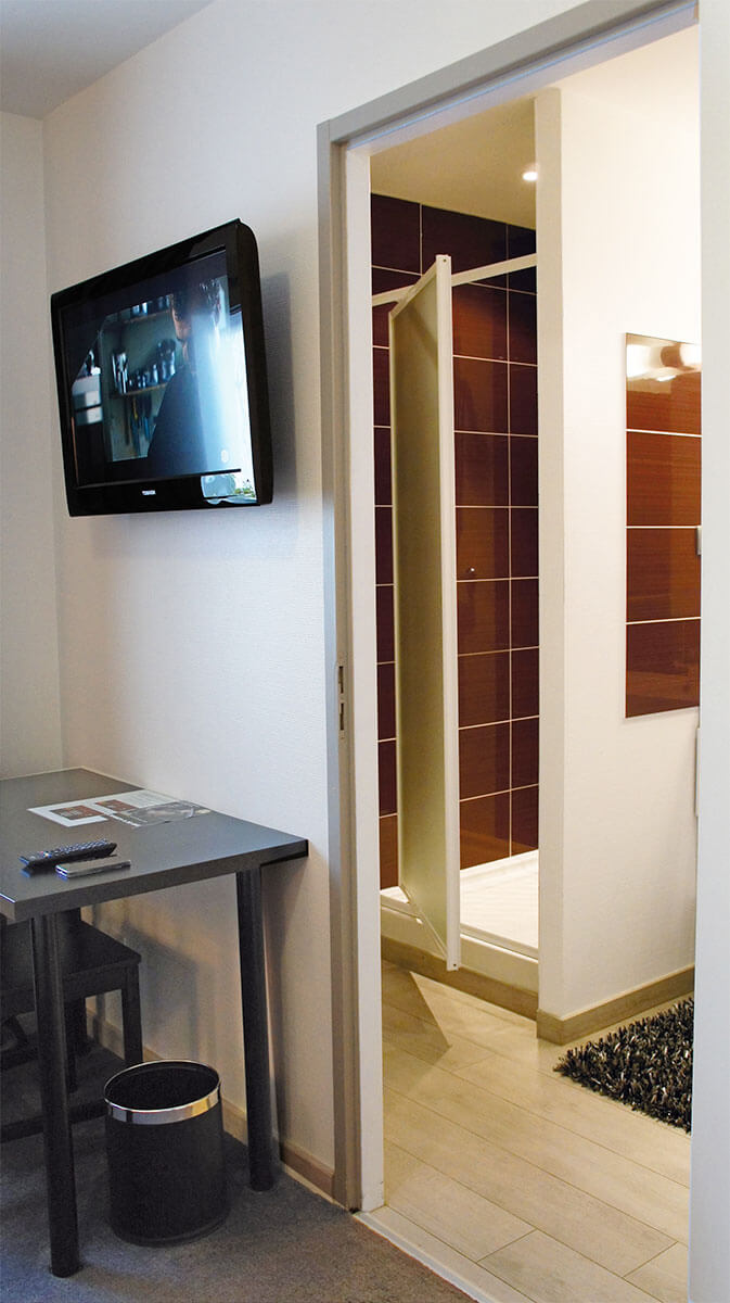 Chambre de 14m² comprenant un lit single (1 personne) avec salle de bain privative, douche, sèche cheveux, penderie, mini bar. Chambre prévue pour 1 adulte.