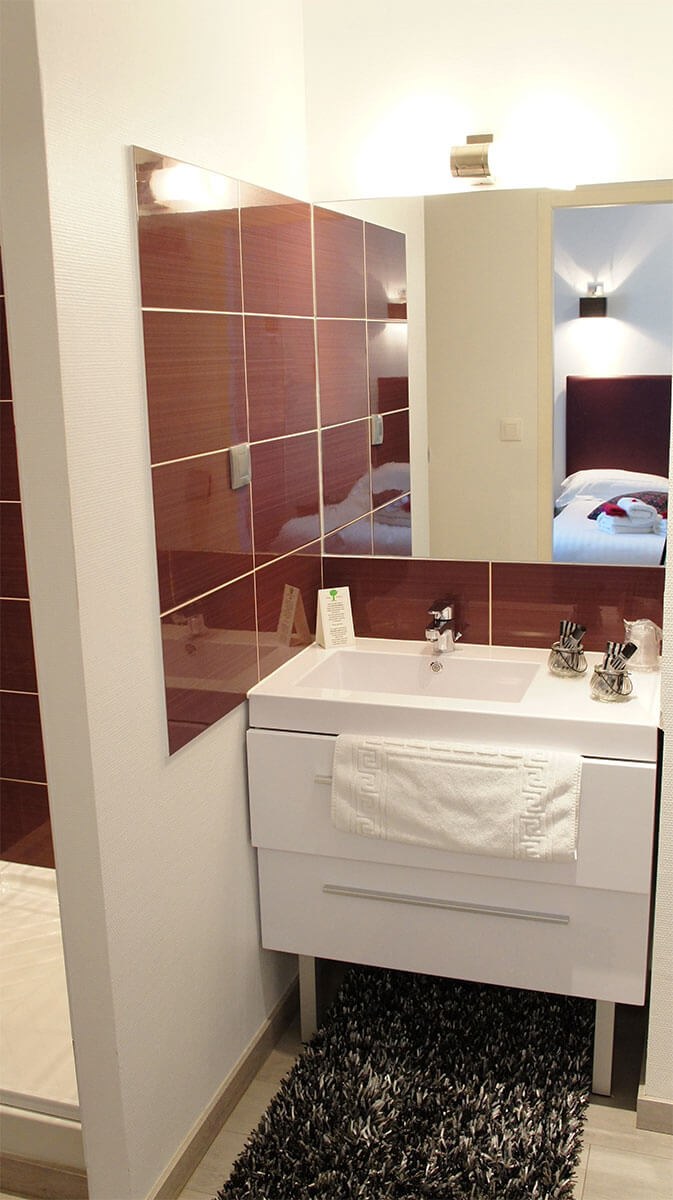 Chambre de 15 m² comprenant un lit double de 140, avec salle de bain privative de 4m², douche, penderie, mini bar. Chambre avec vue possible sur le Rhône et les monts du Bugey ou sur l’arrière du bâtiment. Chambre prévue pour 2 adultes.