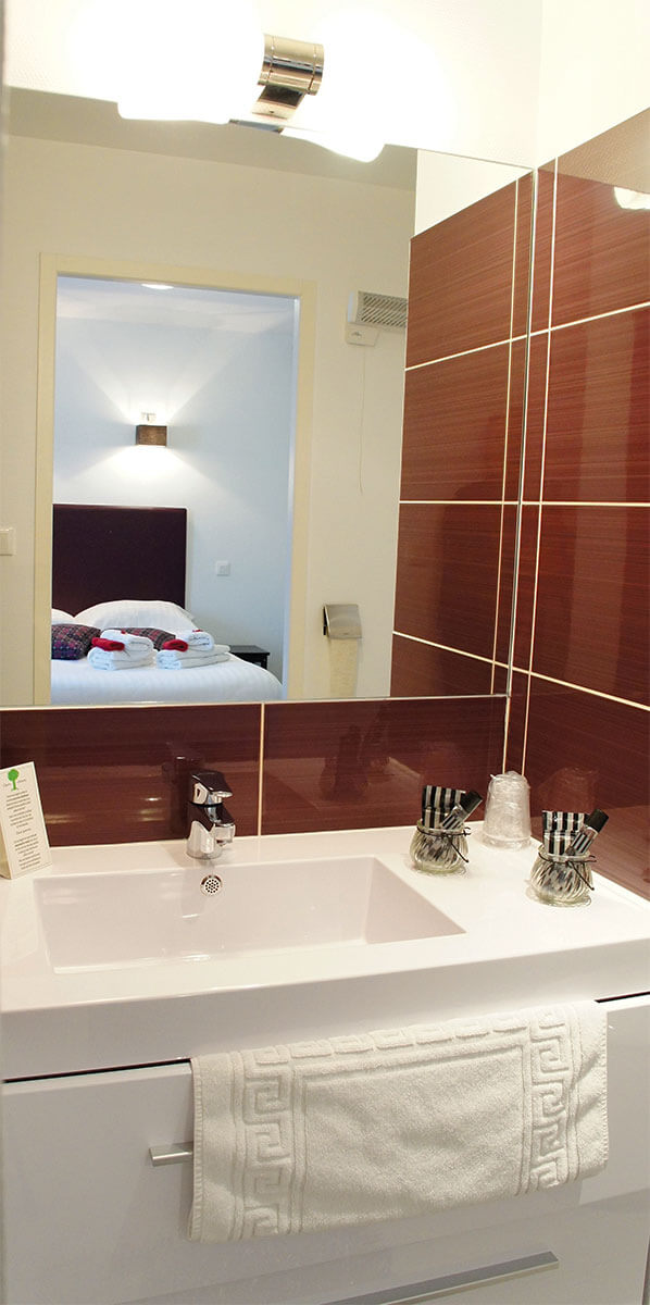 Chambre de 15 m² comprenant un lit double de 140, avec salle de bain privative de 4m², douche, penderie, mini bar. Elle dispose d’une télévision avec écran LCD de 82 cm avec un accès gratuit aux chaînes de la TNT, le bouquet Canal Plus, Canal Plus premier et Bein Sports.